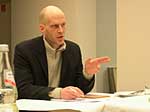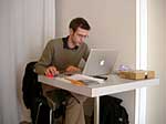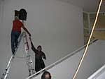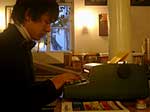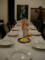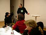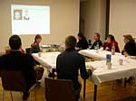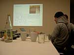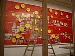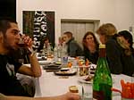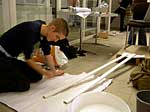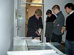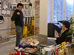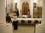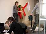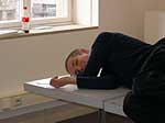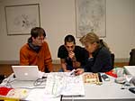 Fama FLUXUS Mythos BEUYS Workshop 15. - 20. 11. 2004 Einleitend zu der Ausstellung „Fama Fluxus Mythos Beuys“ fand in der Städtischen Galerie Sindelfingens eine Woche lang ein Workshop mit den ausstellenden Studierenden von der Kunsthochschule Berlin-Weißensee statt. Während die eigenen Arbeiten aufgebaut wurden, stand ein Archiv zum Thema Fluxus und Beuys zu Verfügung, in dem sich neben Katalogen, Sekundärliteratur und themenbezogenen Filmen auch Inkunabeln, Gedrucktes und Objekte aus damaligen Fluxuszeiten finden ließen. Die Originale aus dem Privatarchiv von Herrn Sauerbier wurden gemeinschaftlich gesichtet und geordnet, wobei nach einer geeigneten Präsentationen in den Vitrinen gesucht wurde. Parallel entstand ein großes Schaubild, dass die erarbeiteten Vernetzungen zwischen Fluxuskünstlern, ihren künstlerischen Vorläufern, die Teilnahme an Fluxus-Festivals sowie die Anbindung an Europa und die Berührungspunkte mit Beuys transparent machte. Hierbei hatte jeder der Workshopteilnehmenden einen individuellen Schwerpunkt, je nachdem, womit er/sie sich zuvor theoretisch in den Seminaren an der KH Berlin-Weißensee auseinandergesetzt hatte. Das Schaubild vereinigte die vielen verschiedenen Blickwinkel und funktionierte mit der Unterstützung der studentischen Kommunikationsdesigner als informative wie auch visuell ansprechende Einführung in die Ausstellung. Zudem bildete es die Grundlage für die noch in der Entstehung begriffene DVD zum Thema Fluxus und Beuys. Eine sehr wichtige Zeit für Kommunikation war das gemeinsame Abendessen. Hier stellten einige Künstler mit Hilfe von Video- und Bildprojektion ihre Arbeit vor, referierten über Hintergründe und Konzepte, die anschließend teils lebhaft diskutiert wurden. Da der Workshop für die Öffentlichkeit zugänglich war, gesellten sich gelegentlich Damen und Herren von der Presse in die Runde. Diese wurden dann wie selbstverständlich in die Gespräche integriert und regten ihrerseits durch gezielte Fragen die Gruppe zu ganzheitlichen Reflektionen über das Ausstellungsprojekt an. So sah man sich gegenseitig über die Schulter, wie Ideen in die Realität umgesetzt und die Hängung oder Installation von bereits mitgebrachten Arbeiten konzipiert wurden. Schließlich fanden die Aktivitäten vor der Ausstellungseröffnung ein Ende. In Gedanken jedoch wird das Thema Fluxus und Beuys noch weiterhin in den Köpfen der Teilnehmenden rumoren. Birte Theiler |