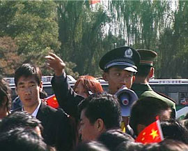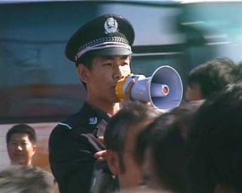 „Ein großes Happening findet in Peking jährlich am Nationalfeiertag statt. Tausende versuchen, umsonst in die Verbotene Stadt und auf den Tiananmen Platz zu gelangen. Dies ist keine Kunstaktion, sondern ein Angebot, das die Volksrepublik seinen Bürgern an diesem Gedenktag anbietet. Auf dem Platz sind Schautafeln und Modelle aufgebaut, die auf die 55-jährige nationale Geschichte und die Errungenschaften der Republik verweisen: Mao, Deng Xiao Ping und der neue Kapitalismus ist gleichermaßen vertreten. Dieser Ort wird immer wieder umfunktioniert und ist gleichzeitig staatlich kontrolliert, und so gibt es hier auch weiterhin kein Gedenken des Massakers an Studenten im Jahre 1989... Mit kurzen Befehlen rufen Sicherheitskräfte durch Megafone, die wie Accessoires einer Performance wirken, wie sich der oder die Einzelne verhalten soll, damit es zu keiner Panik oder Stau komme. Dieses kurze Videodokument aus einem Land, das Mitteleuropäern immer noch äußerst exotisch vorkommt, ist ein Ausblick auf eine Arbeit von Maya Schweizer und Clemens von Wedemeyer über ein paar Verhältnisse in der Stadtentwicklung, seinen Vorbildern und ihrer Protagonisten in China.“ C.v.W. |